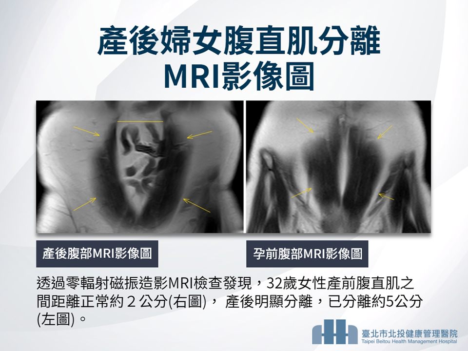 丈夫深知懷孕過程對女性身體會造成很大的負擔,因此近期為她安排至北投健康管理醫院安排健康檢查,也想好好釐清肚皮中央不明突起的狀況。透過腹部零輻射磁振造影檢查(MRI)可清楚見到在肚臍上下方因腹直肌分離,腹壁中央的腹白線鬆弛,而導致腹內脂肪與腸子向外凸出,形成三角形的尖凸狀。