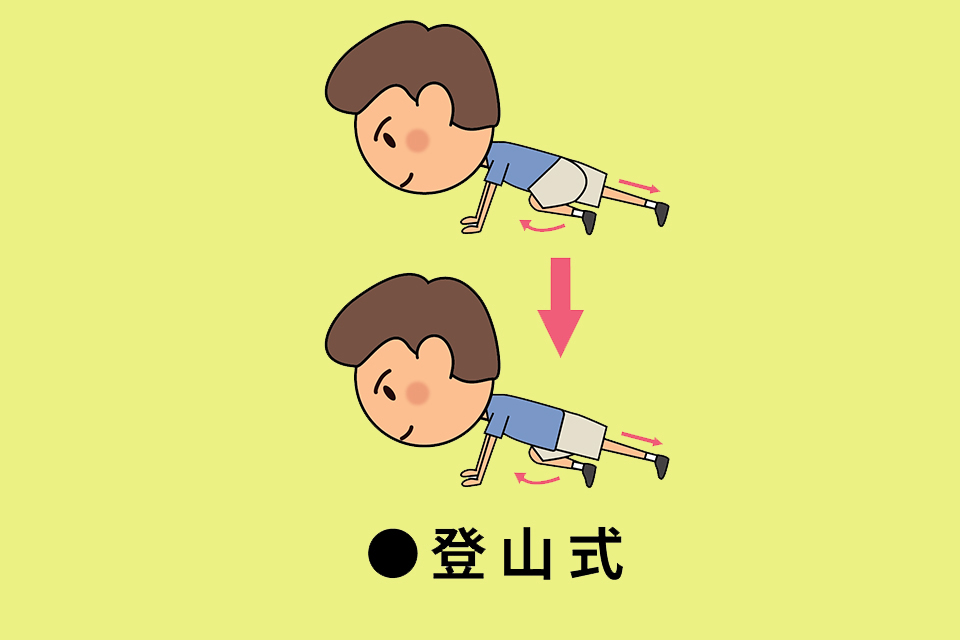 【第1式】登山式:伏地挺身預備姿勢,上肢保持穩定,雙腳交替抬膝至胸口,跑動時身體保持穩定,可訓練核心肌群。
