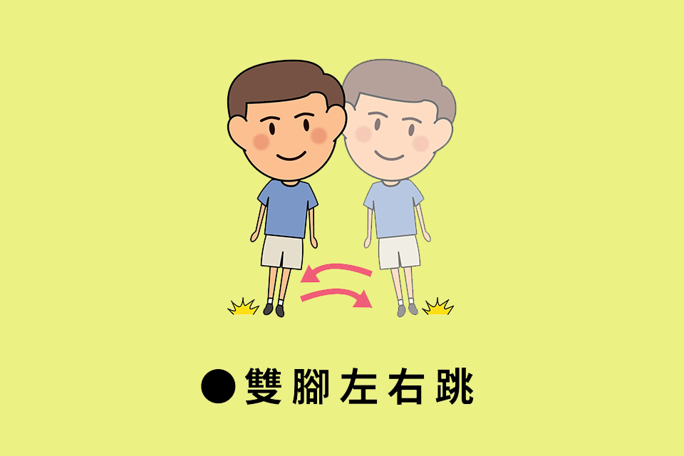 【第2式】雙腳左右跳:站姿,雙手叉腰預備,上肢保持穩定,雙腳向左跳,再向右跳,可訓練下肢平衡、協調及爆發力。