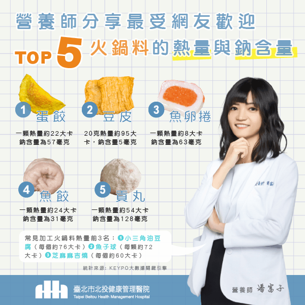 北投健康管理醫院營養師潘富子表示,其實不難發現火鍋料大多都是屬於加工食品,而加工食品在製作過程中為了要維持口感及味道,都會添加上較多的油脂及鹽或其它調味料。在攝取的份量上就得留意,千萬不可因火鍋料看起來小小的,就忘了要控制攝取份量,避免開心吃鍋,卻不小心造成熱量爆表、鈉含量超標。
