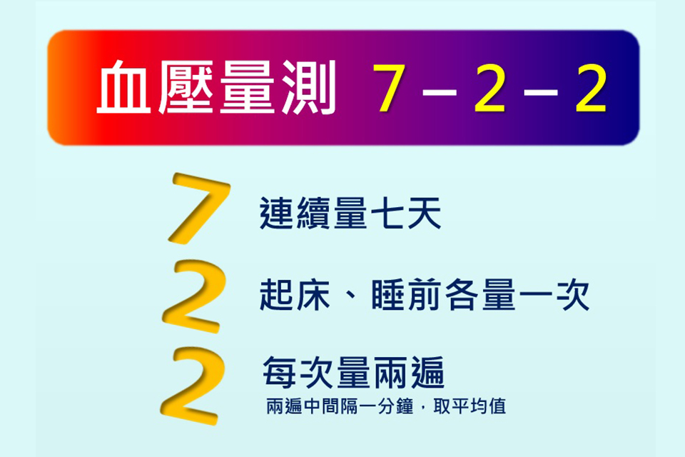 為了要讓更多民眾注意到自己的血壓,如何正確測得血壓,台灣高血壓學會持續推廣居家血壓量測及722原則: