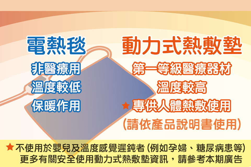 ▸動力式熱敷墊:屬於醫療器材,溫度較高,專供人體熱敷使用,使用時須謹慎注意溫度與時間的控制,否則容易燙傷。