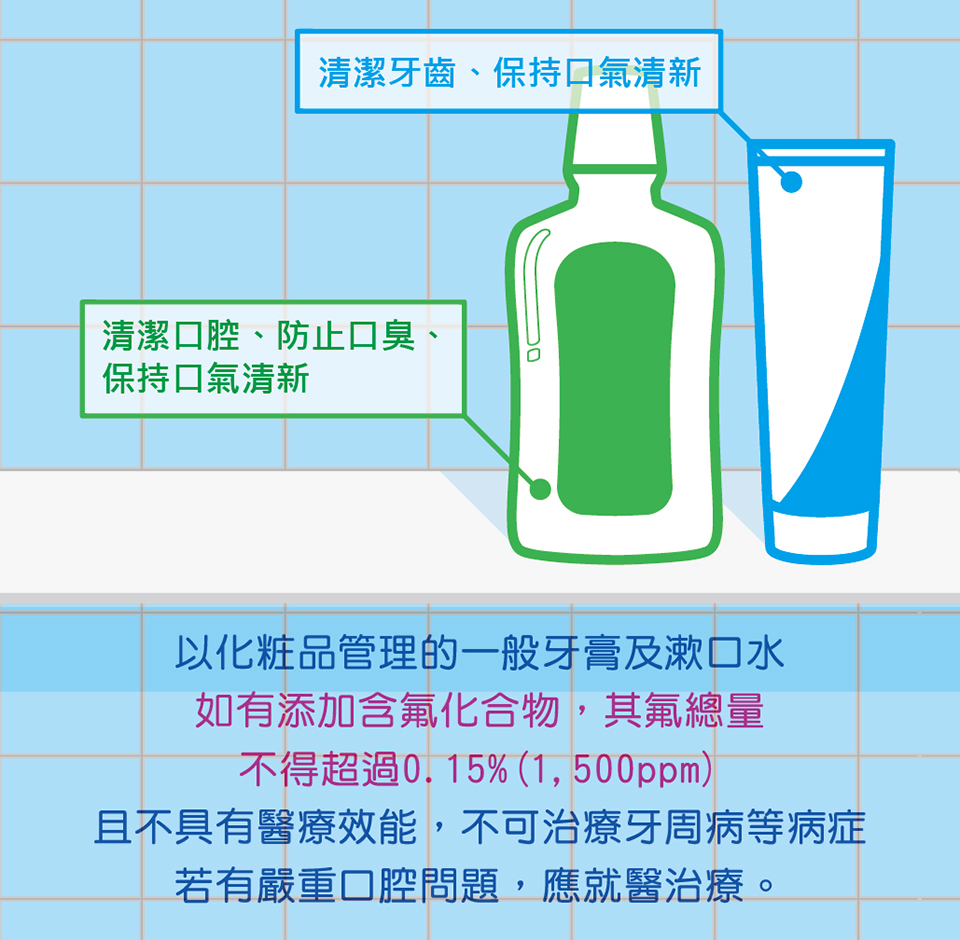 食藥署提醒,以化妝品管理的一般牙膏及漱口水如有添加含氟化合物,其氟總量不得超過0.15%(1,500ppm),且不具有醫療效能,不可治療牙周病等病症;若有嚴重口腔問題,應就醫治療。而漱口水於刷牙後使用效果較佳,不應以漱口水取代刷牙。