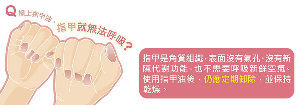 至於坊間流傳著「擦指甲油會讓指甲無法呼吸」的說法,食藥署解釋,指甲是一種由蛋白質、角質素、維生素、礦物質所組成的角質組織,如頭髮一般,表面並沒有氣孔,沒有新陳代謝的功能,也不需要呼吸新鮮的空氣。