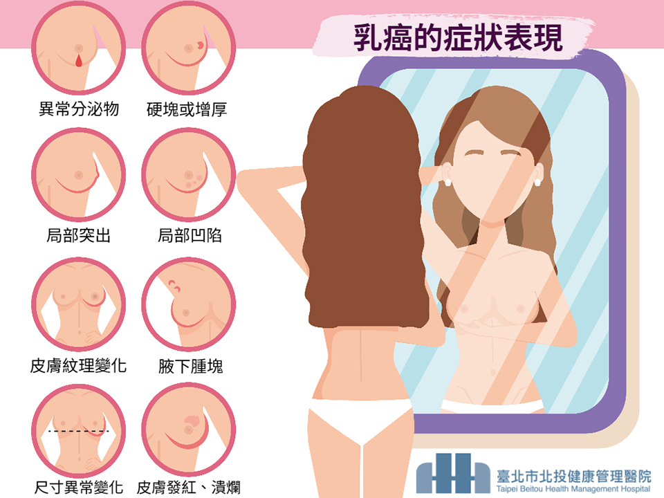 【正解】:錯!乳癌依照病理的分類不是只有一種,不同的乳癌類型或是不同時期的乳癌症狀表現都會不太一樣。要注意的是乳癌的表現不只有硬塊而已,還會出現如乳頭或周圍有皮疹或發紅、一邊或兩邊乳房大小或形狀產生變化、乳頭外觀出現如凹陷等變化、乳房不適或搔癢、乳房顏色改變、乳房短時間內出現尺寸改變、乳頭皮膚脫皮、乳房增厚或腫脹等。